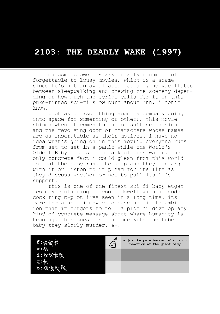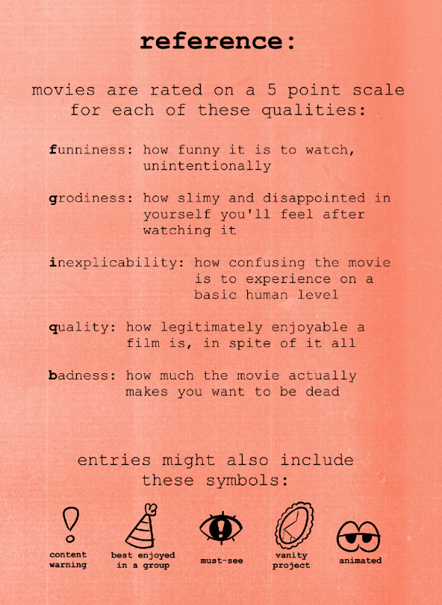 88 pages of reviews of bad movies, rated on a five point scale on how funny, gross, inexplicable, passable and inherently bad they are. includes content warnings regarding sex and various -phobias when applicable and gratuitous.